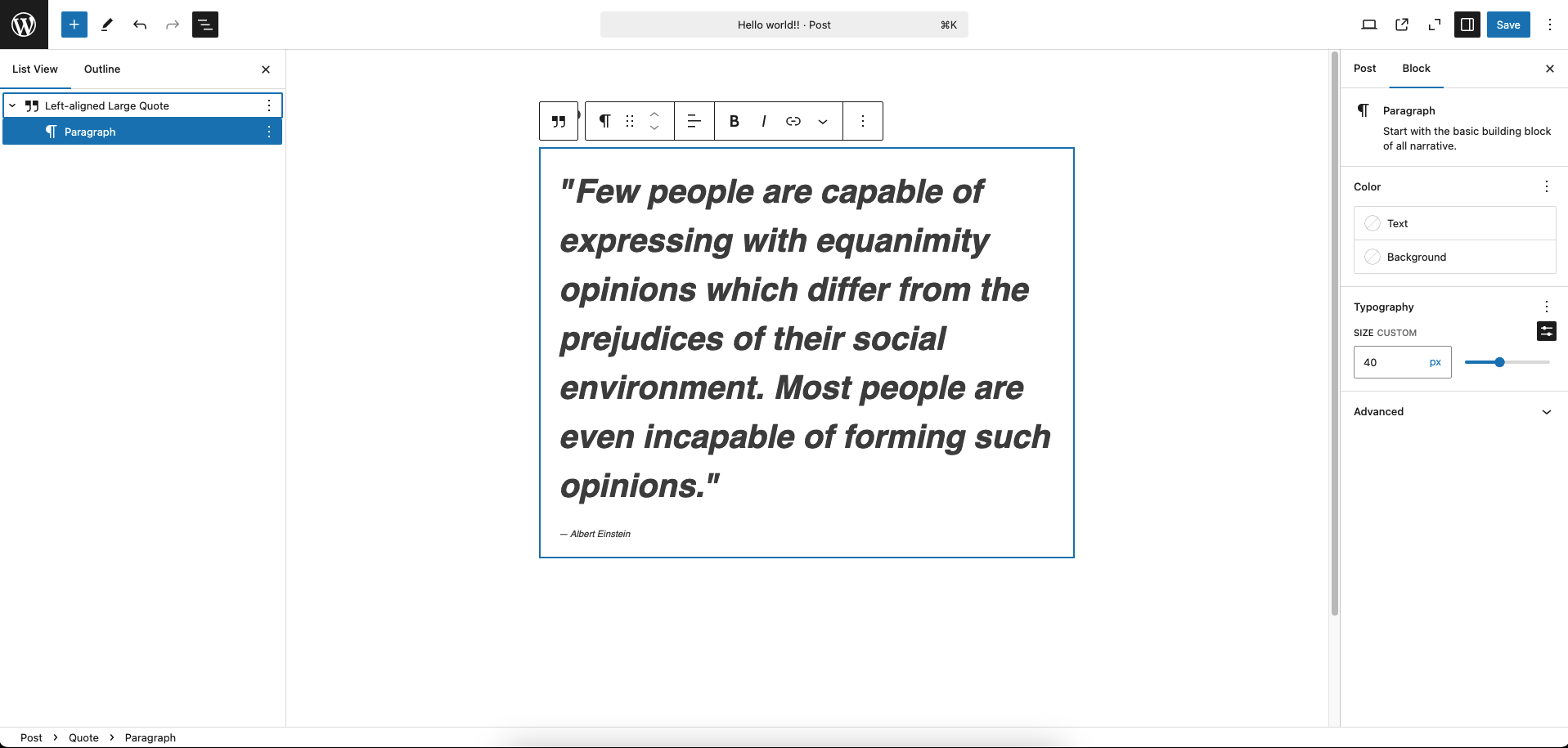 2. The "Left-aligned Large Quote" pattern now correctly inserts a quote
