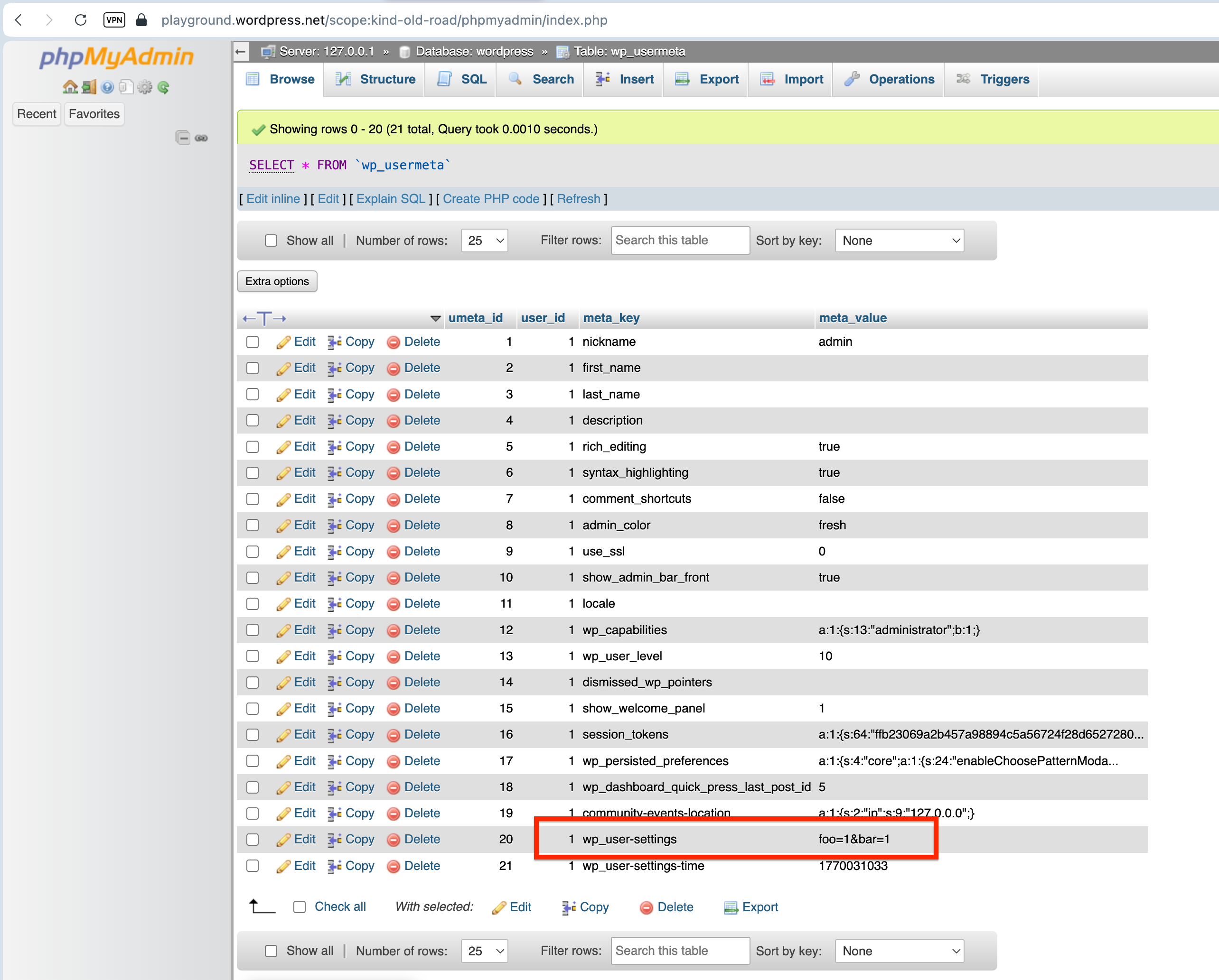 6. Look for meta value of the meta_key `wp_user-settings` and confirm it