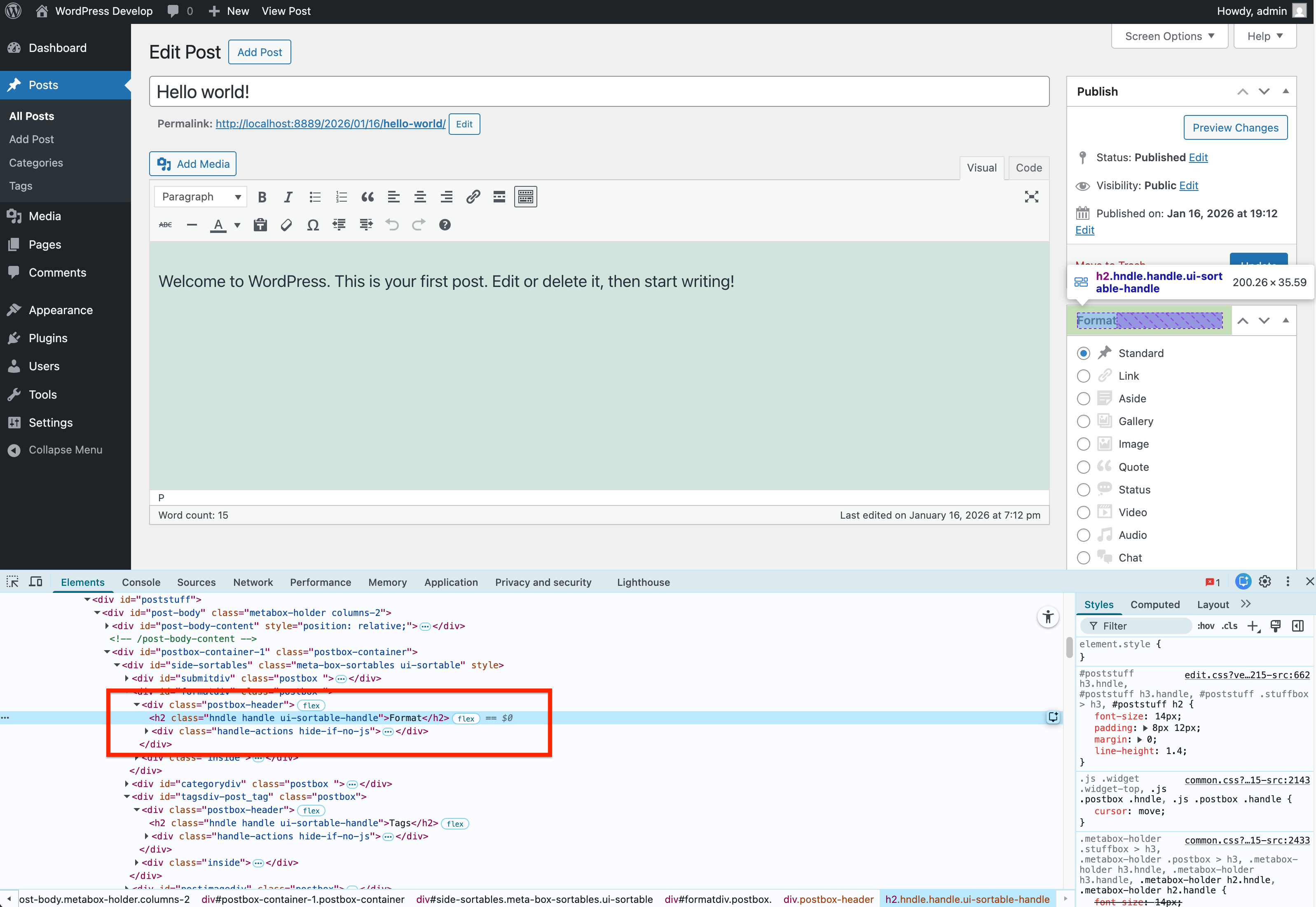 2. .handle class is added to the div.postbox-header > h2 tag and .hndl