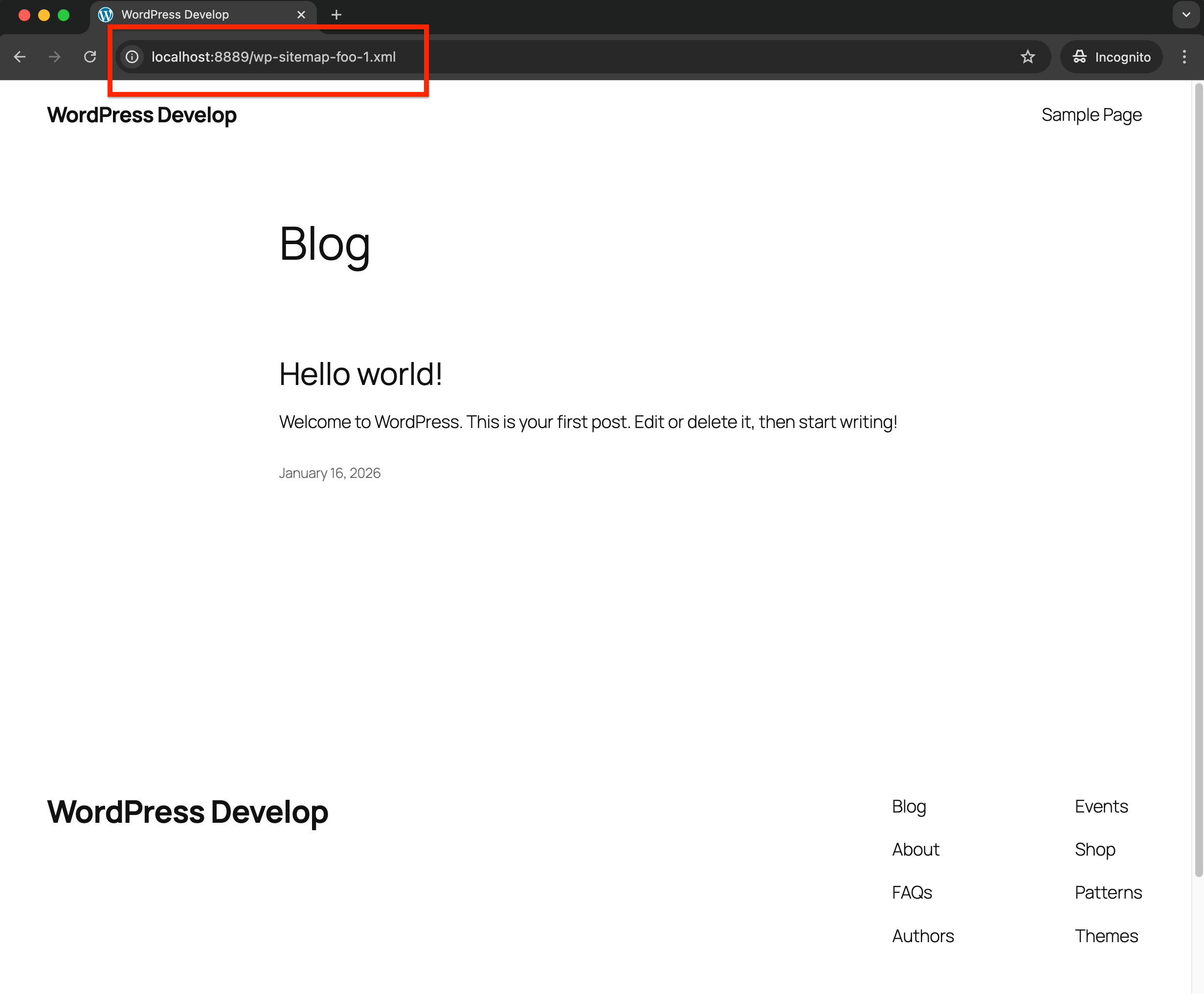 2. Visit /wp-sitemap-foo-1.xml (E.g.: http://localhost:8889/wp-sitemap-